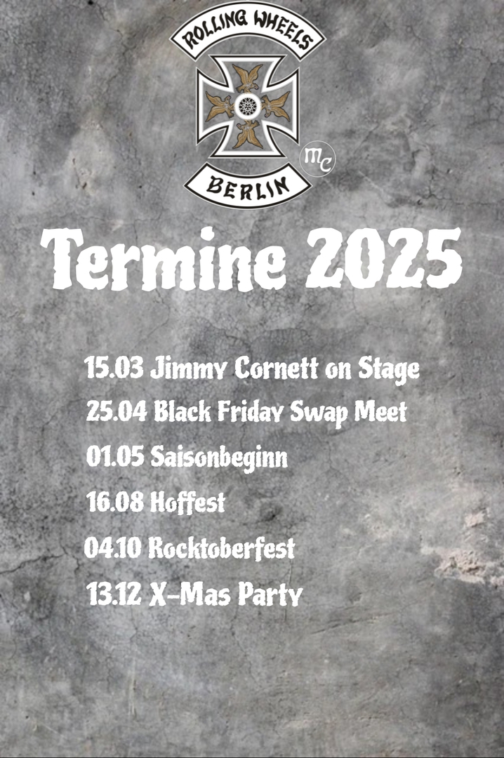 | 24.-26. | Rolling Wheels MC Berlin | MAFZ Paaren bei Berlin Gartenstraße 1-3 14621 Schönwalde-Glien |